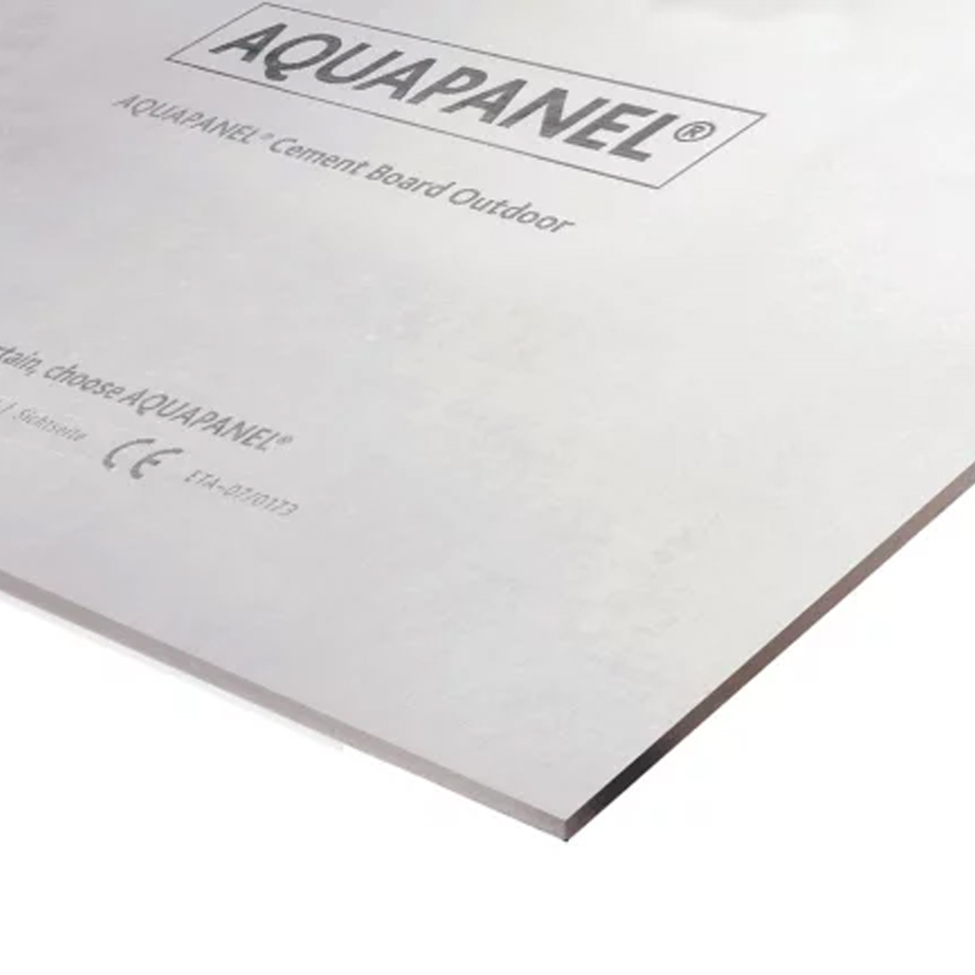 Plaque ciment résistante à l’eau et aux intempéries. Aquapanel est conçue pour salles de bains, douches italiennes, façades et plafonds extérieurs, excellente stabilité dimensionnelle et adhérence carrelage.